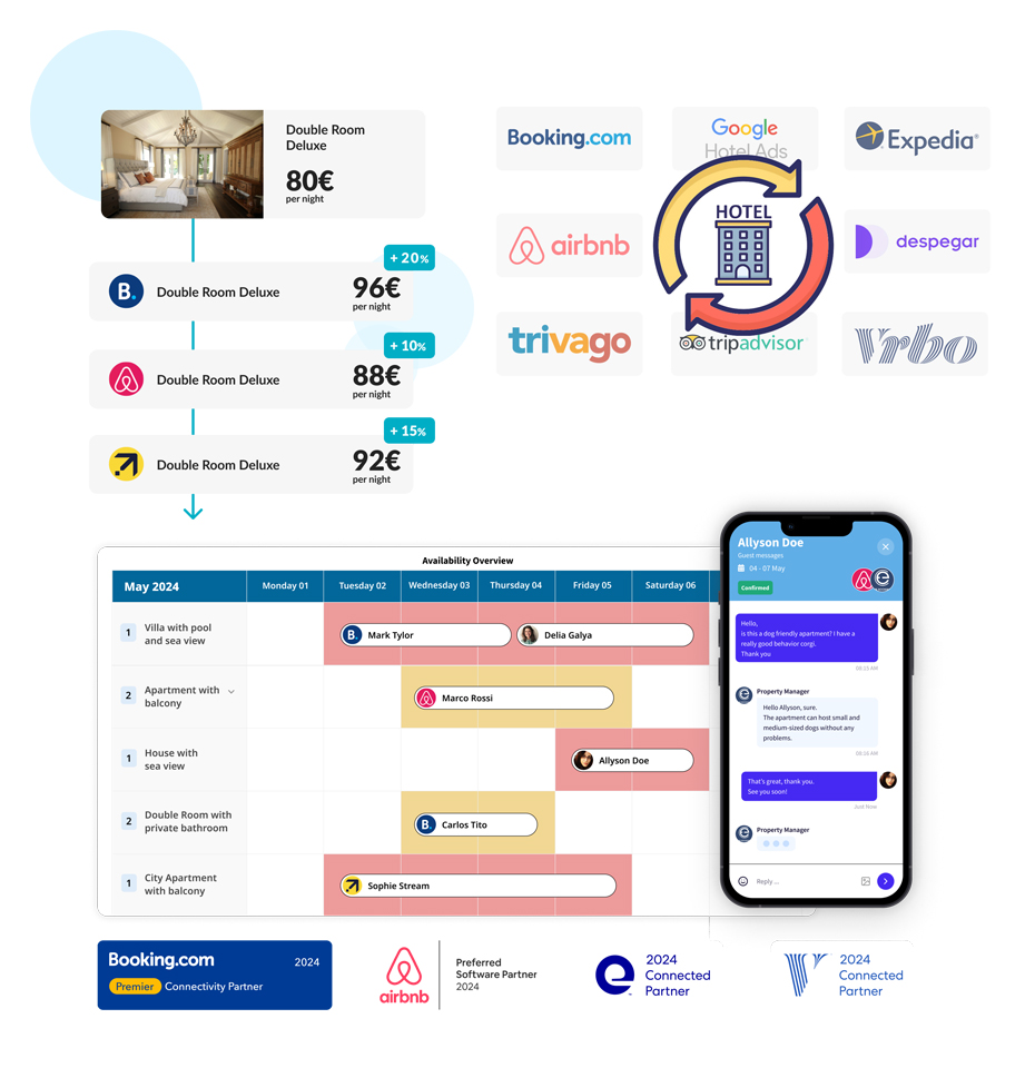 Channel manager omogućuje sinkronizaciju raspoloživosti i cijena s Booking.com, Airbnb i drugim platformama u stvarnom vremenu. Sve rezervacije i poruke organizirane su u jednom inboxu, što olakšava komunikaciju i upravljanje. Ovaj sustav štedi vrijeme, sprječava dvostruke rezervacije i osigurava ažurirane informacije na svim kanalima.