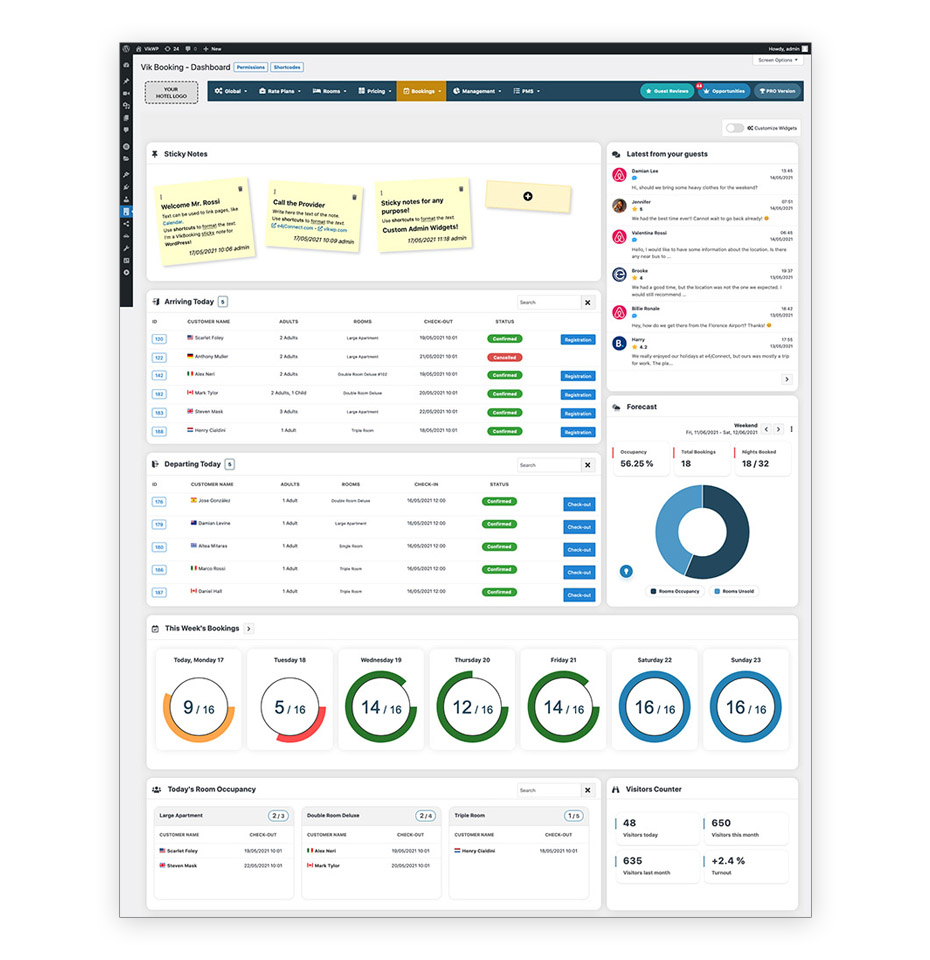 Sustav uključuje recepcijske alate za upravljanje prijavama i odjavama te organizaciju domaćinstva. Napredne PMS funkcije omogućuju praćenje statusa soba, planiranje čišćenja i kreiranje izvještaja o poslovanju. S detaljnim analizama prihoda i rezervacija, alati pomažu optimizirati poslovanje i povećati učinkovitost. Sve je centralizirano za jednostavno upravljanje.