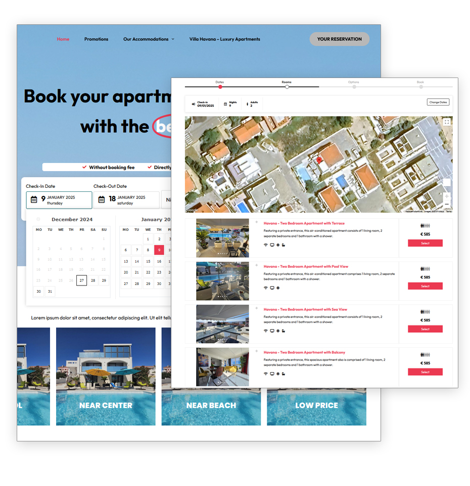 Integrirani booking engine omogućuje gostima dovršavanje rezervacija izravno na vašoj web stranici, bez preusmjeravanja na vanjske linkove. Ovo osigurava profesionalno korisničko iskustvo, brži proces rezervacije i veću konverziju. Sve je centralizirano i jednostavno za upravljanje, pružajući maksimalnu kontrolu nad vašim rezervacijama.